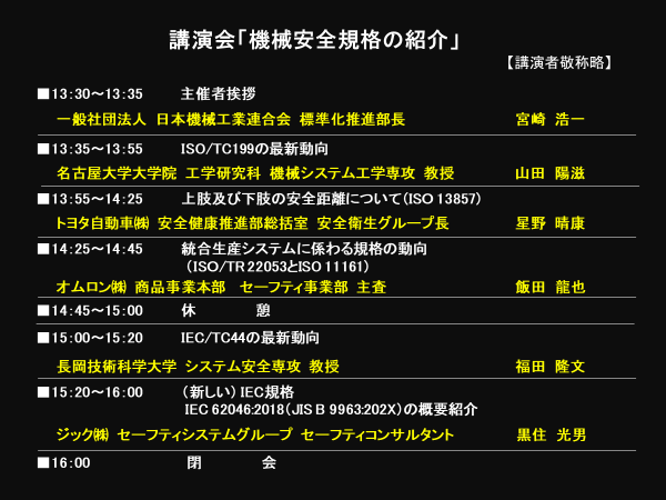 本講演会では、日機連が国内審議団体であるISO/TC199(機械類の安全性)及びIEC/TC44(機械類の安全性-電気的側面)の概要と最新動向を紹介した。